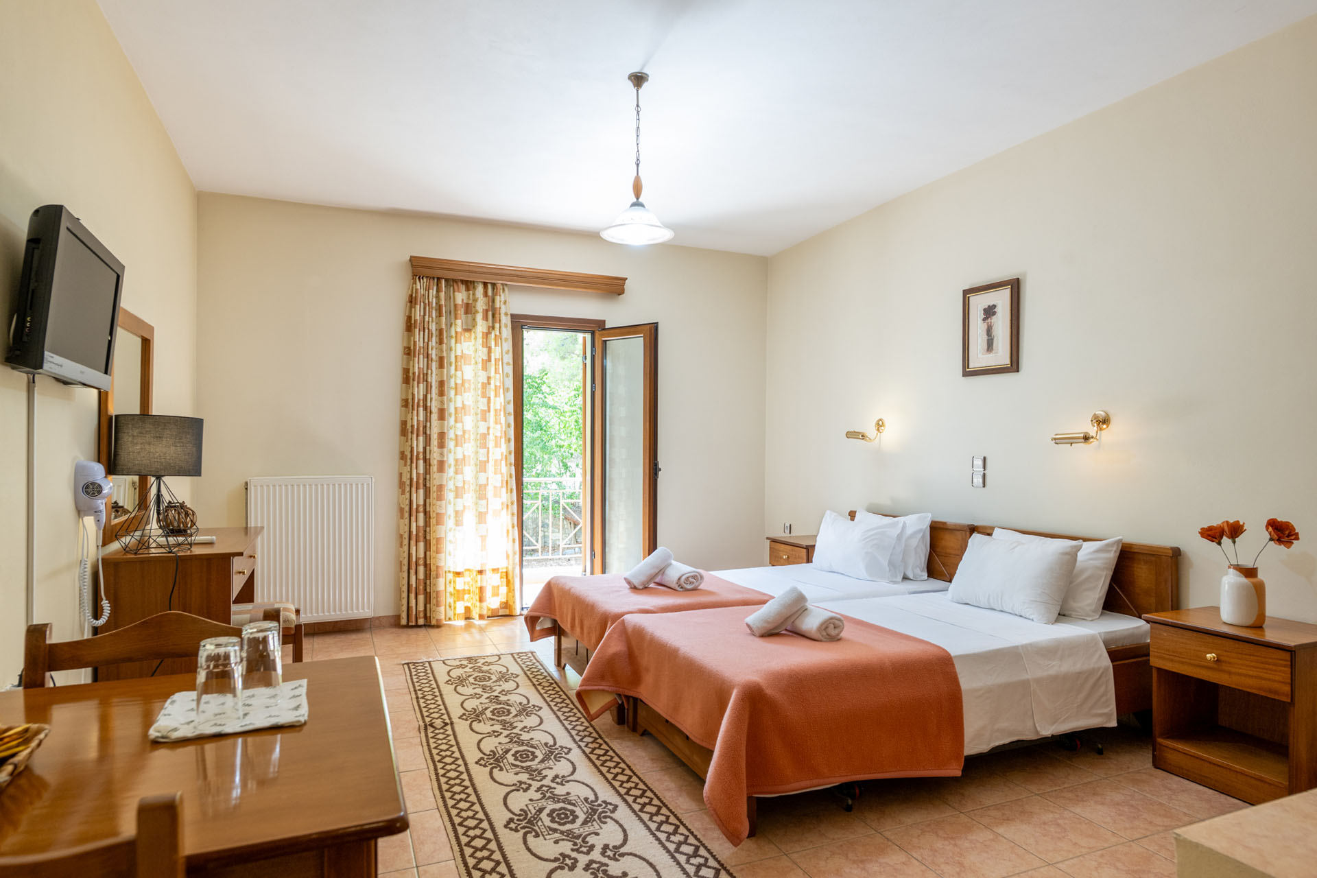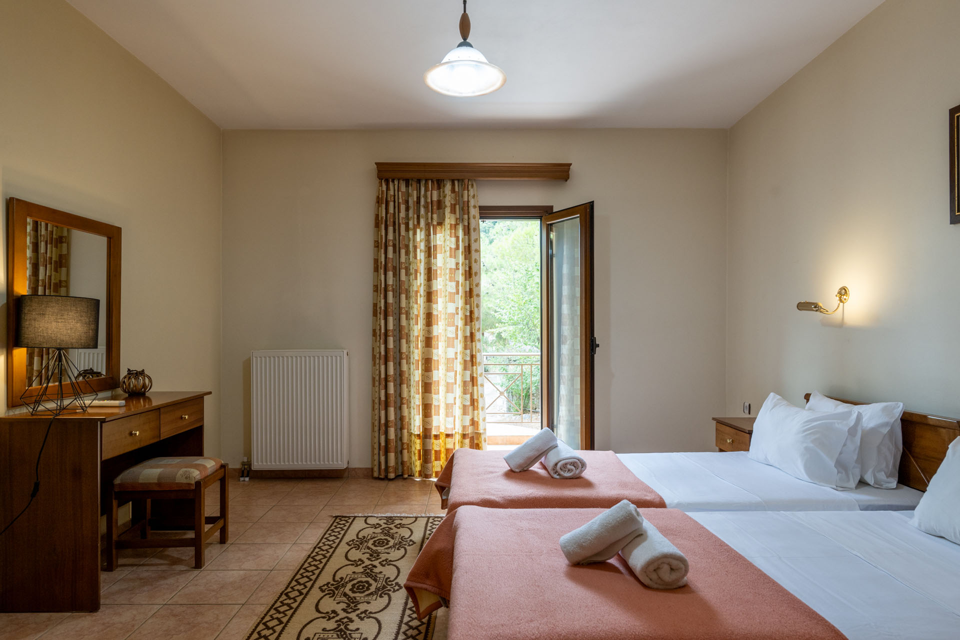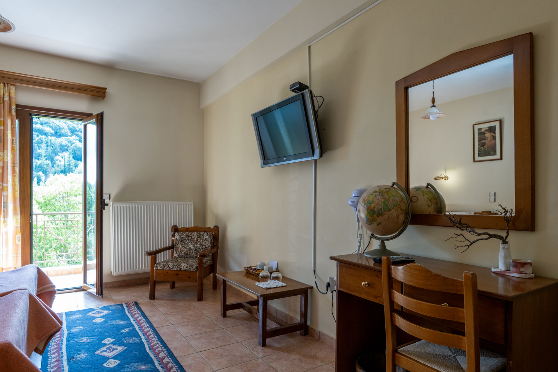 Welcome to our spacious double room at Achais Hotel, where comfort meets breathtaking views of the surrounding mountains and the charming village of Planitero. As you step into our elegantly furnished room, you’ll immediately be greeted by a sense of tranquility and warmth. The room features a comfortable bed adorned with crisp linens and plush pillows, inviting you to unwind and relax after a day of exploration. Large windows offer panoramic views of the majestic mountains of Mount Helmos and the idyllic village, providing a picturesque backdrop to your stay. In addition to the stunning views, the room is equipped with modern amenities to ensure a comfortable and convenient experience. A spacious en-suite bathroom offers a luxurious shower and complimentary toiletries, while a cozy seating area provides the perfect spot to enjoy a morning coffee or evening glass of wine. Whether you’re seeking a romantic getaway or a peaceful retreat in nature, our double room at Achais Hotel offers the perfect blend of comfort and serenity for an unforgettable stay.